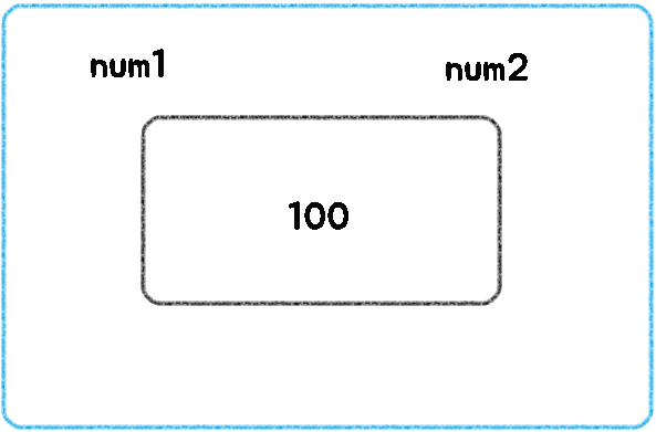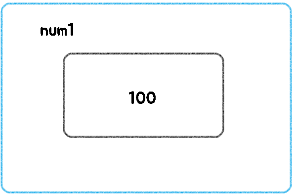 num1이라는 변수 이름의 메모리공간에 100이 할당되어있습니다.